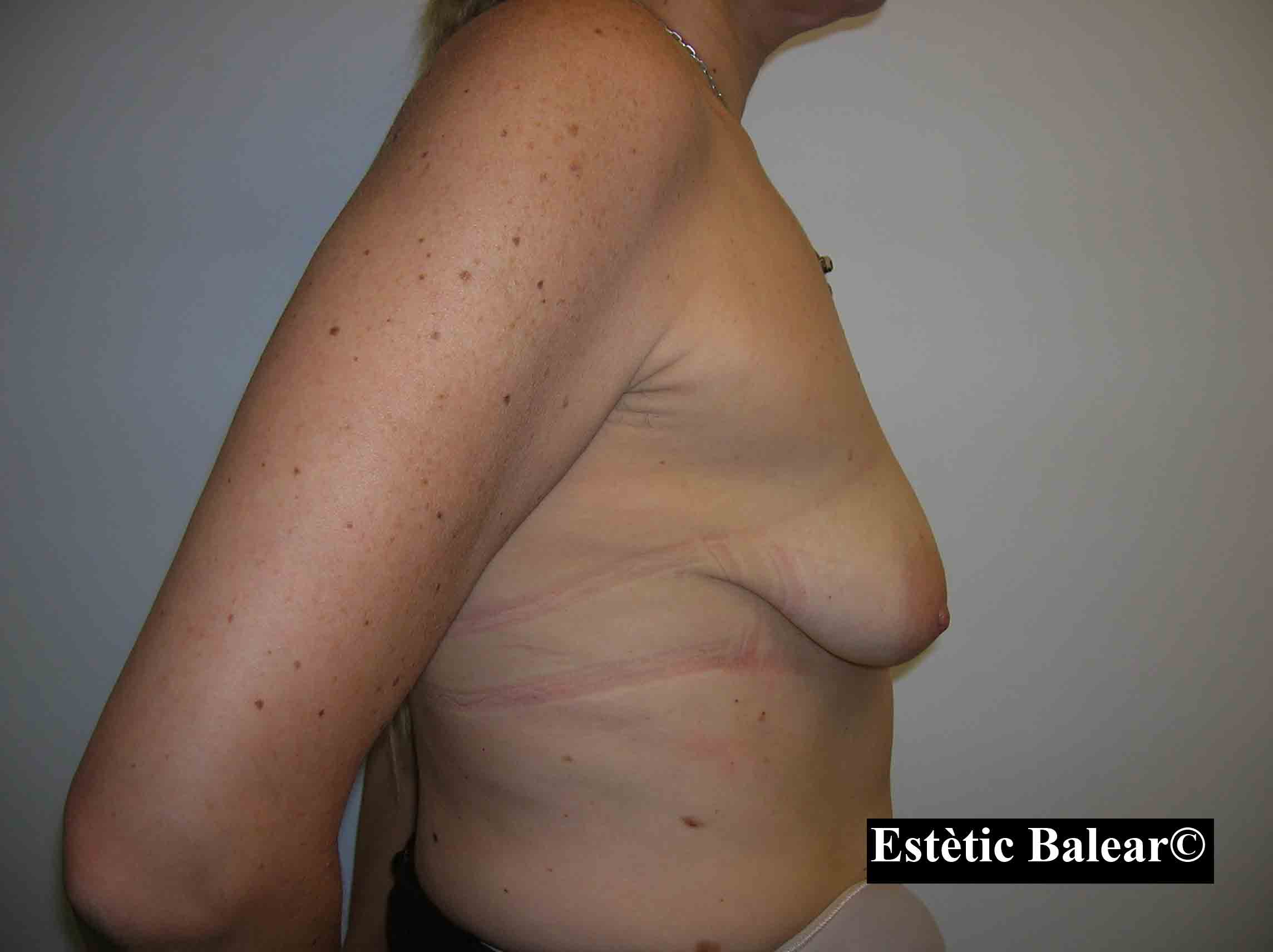 En la imagen se muestra un caso de mastopexia o elevación mamaria con aumento mediante la colocación de una prótesis mamaria. El médico especialista en Cirugía Plástica conoce las diversas técnicas de mastopexia y le aconsejará de la más adecuada para usted.
